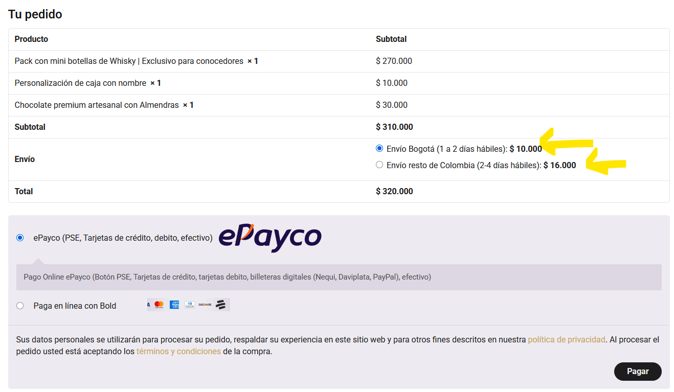 Una vez ingresados y seleccionados los datos solicitados, la plataforma calculará de manera automática el precio del envío dependiendo de los productos seleccionados y la ciudad de destino. IMPORTANTE: Todos nuestros pedidos son despachados desde la ciudad de Bogotá, Colombia. El precio del envío es asumido al 100% por el cliente.