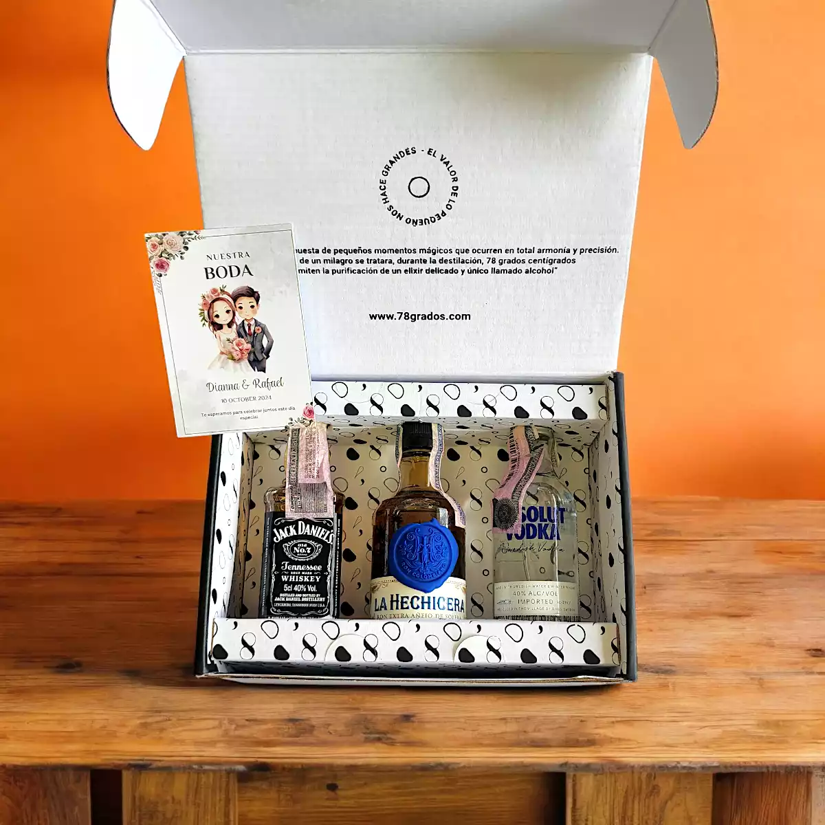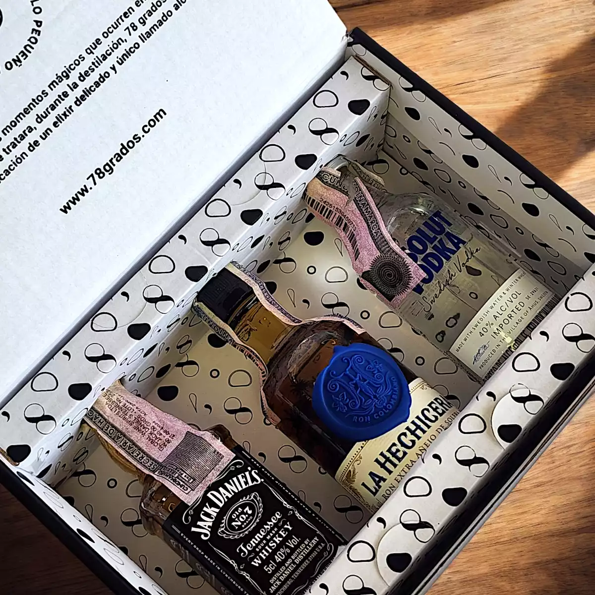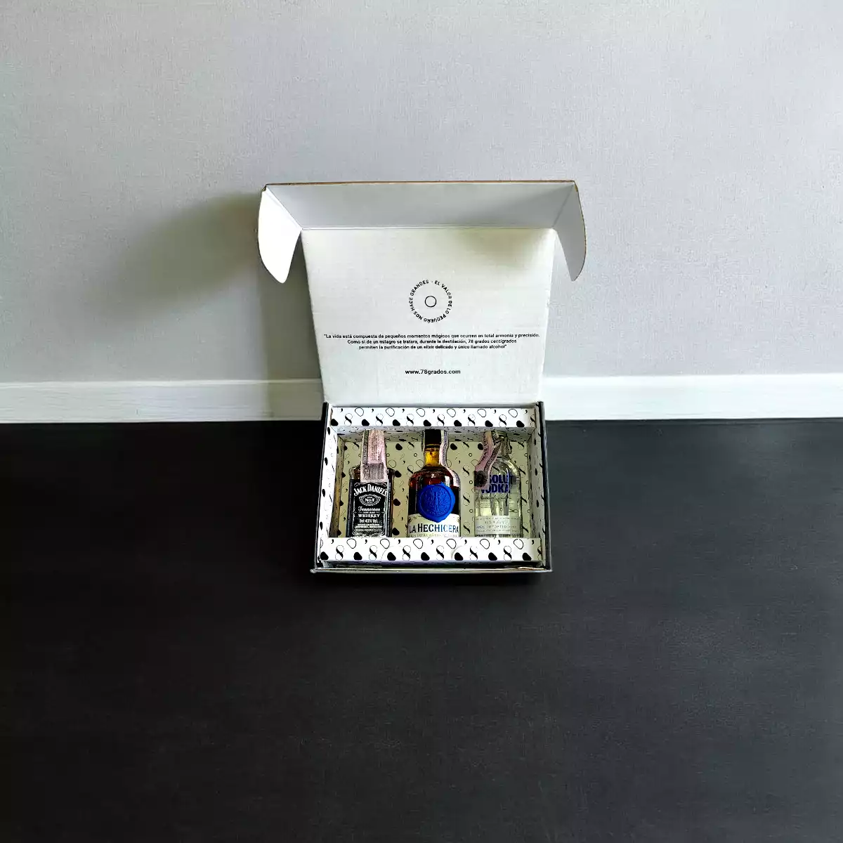 Exclusiva caja premium con 3 mini botellas de licor surtidos pre seleccionados: