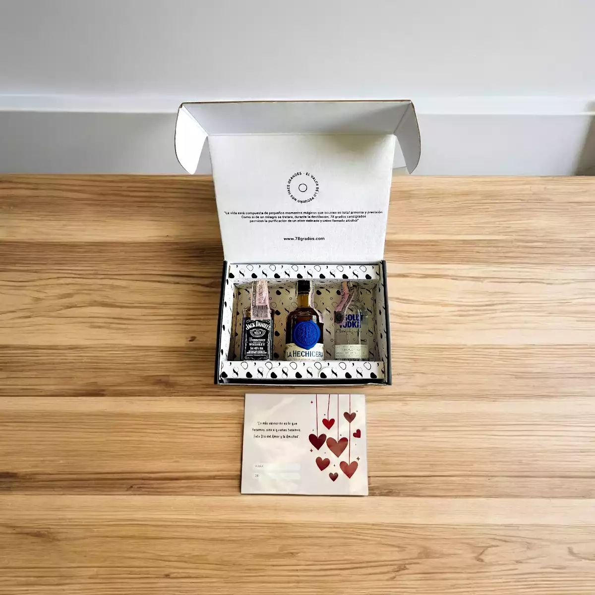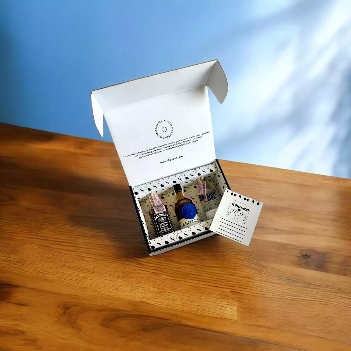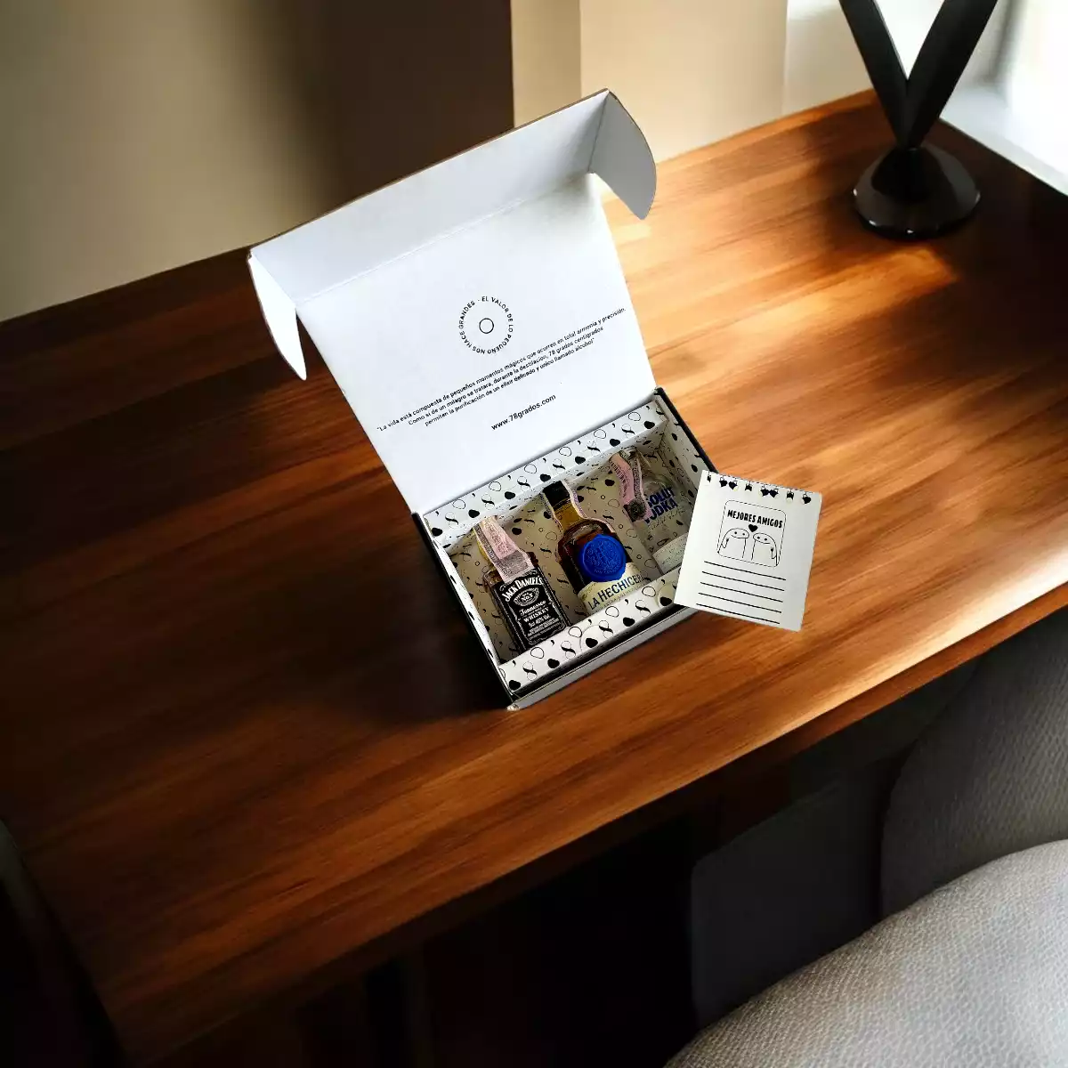 Exclusiva caja premium con 3 mini botellas de licor surtidos pre seleccionados: